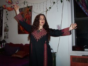 One of the transformations I find personally offensive: a beautiful woman with long frizzy hair wearing a Palestinian or Bedouin dress is transformed into an “office lady” with a cute little 40’s blouse and frizz straightened into middle-class acceptability. Isn’t this indicative of a kind of ethnic self-loathing? At least on the part of Stacy, who, come on, has got to be a Jewish girl from Long Island, right? Or on the part of the executive producers, five of whom have fairly obviously Jewish names? Or if not self-loathing, doesn’t it show a more general bias against “ethnicity”? As I mentioned, I couldn’t find the sequence, but here’s me doing the “before” persona (pictures of me with my hair straightened, yes, I do have some, are so odiously bourgeois-looking that I will indulge in some rare self-censorship for once):